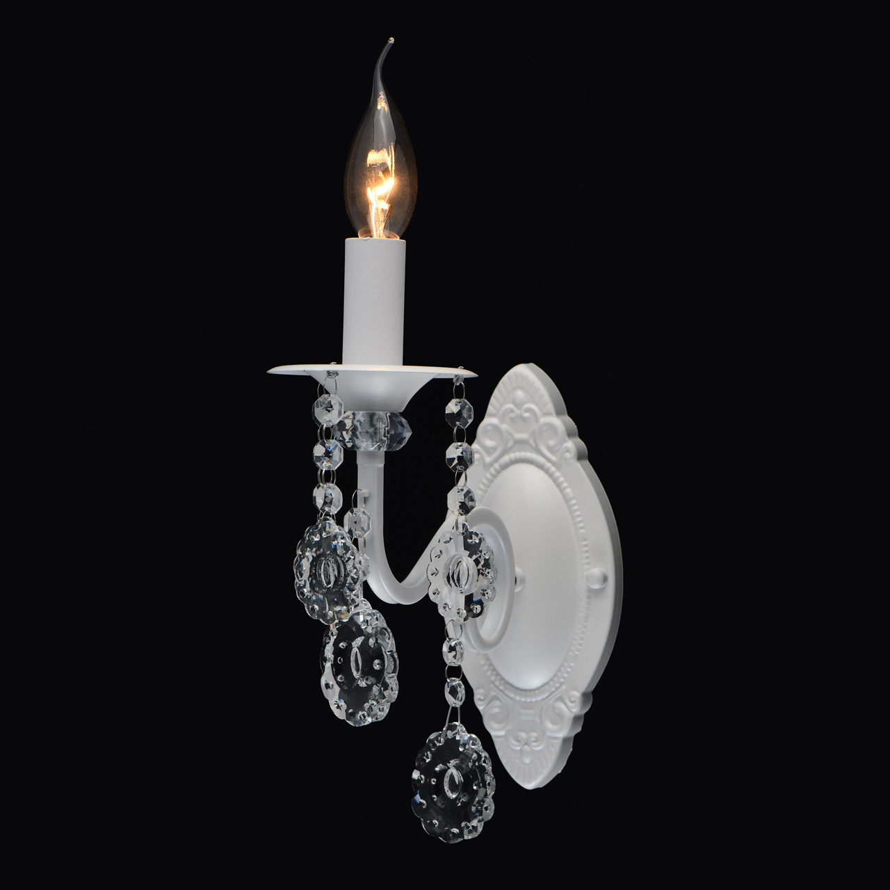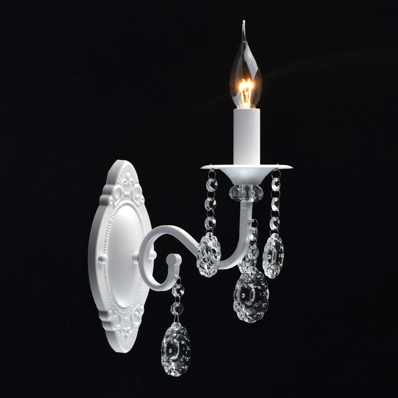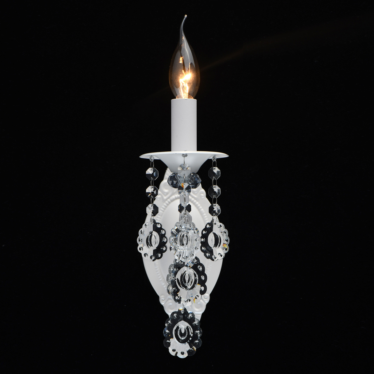 Основание светильника выполнено из металла и окрашено в белый цвет. Светильник декорирован прозрачным хрусталем оригинальной формы.