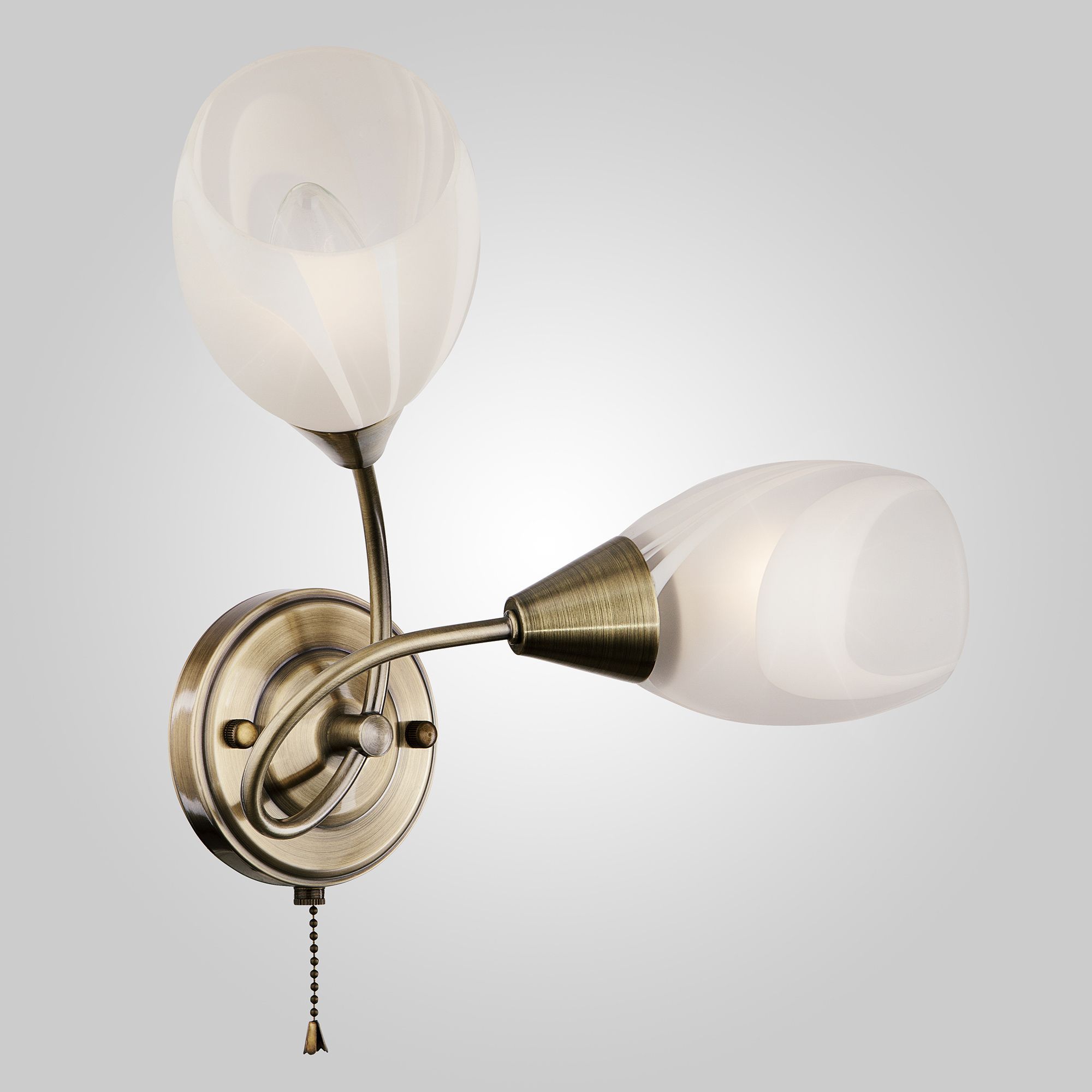 Бра со стеклянными плафонами 2275/2 античная бронза создаст качественное дополнительное освещение и станет эффектным дополнением к основному источнику света. Благодаря белому стеклянному плафону бра создает мягкое равномерное свечение. В качестве источника света используются сменные лампы типа "Свеча" или "Шар" с цоколем E27.