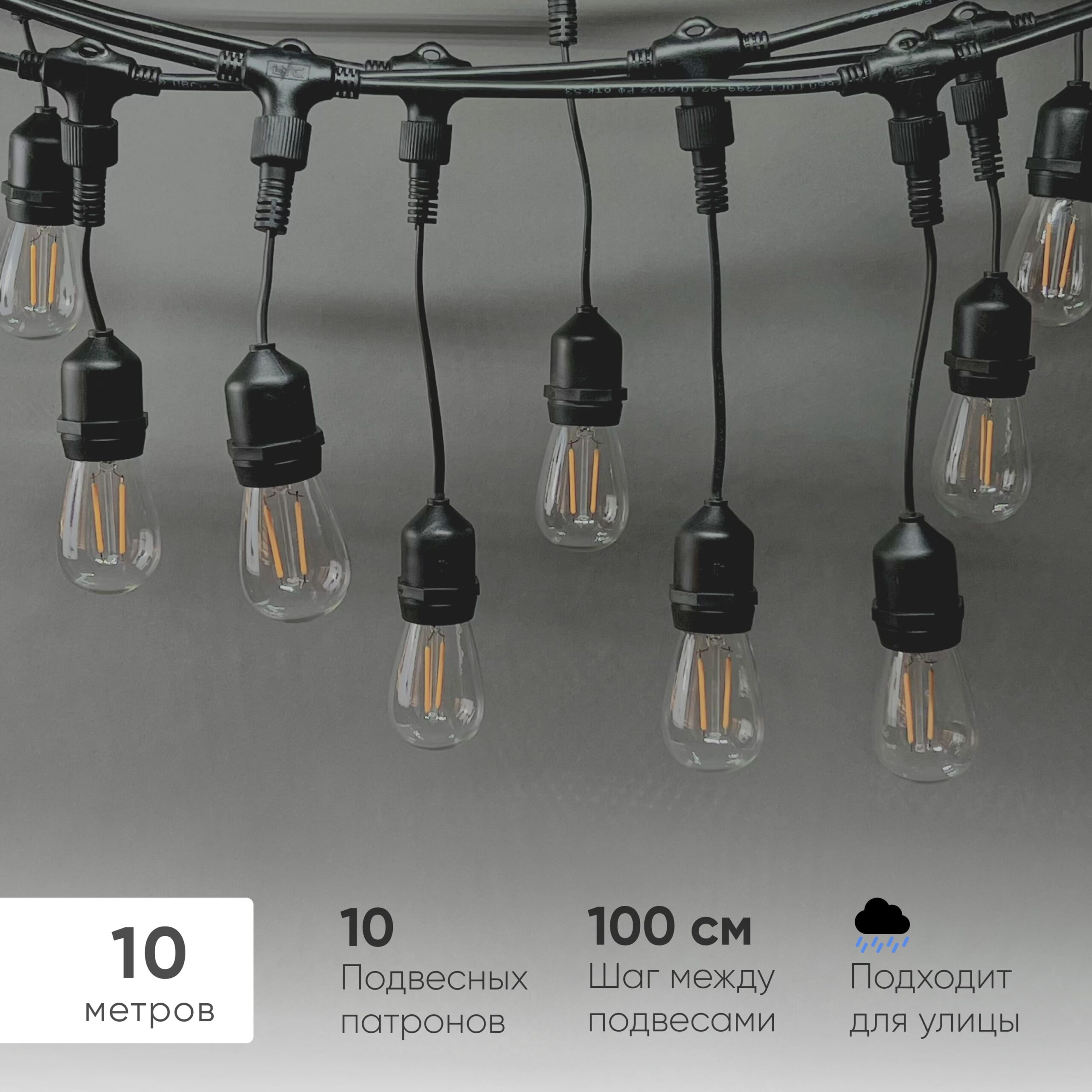Белт-Лайт UNIBELT 10м, Провод Черный Каучук, Шаг 100 см, 10 Подвесных Патронов, IP65 LTC UBL10m/10L-1 в Тюмени