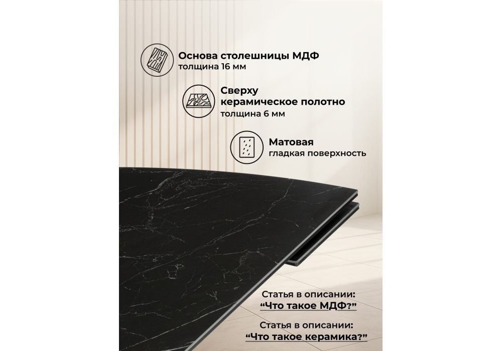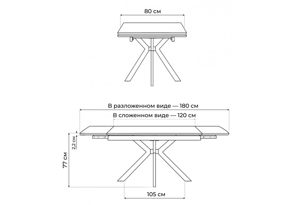 Материал каркаса - металл; Материал столешницы - Керамика; Ширина - 80; Высота - 77; Длина стола в разложенном виде - 180; Длина - 120;