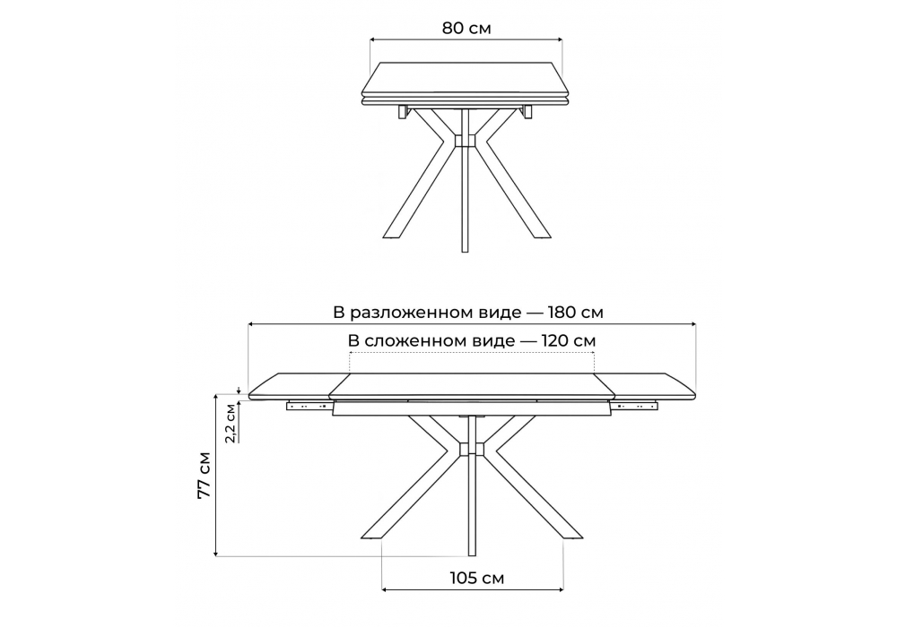 Материал каркаса - металл; Материал столешницы - Керамика; Ширина - 80; Высота - 77; Длина стола в разложенном виде - 180; Длина - 120;