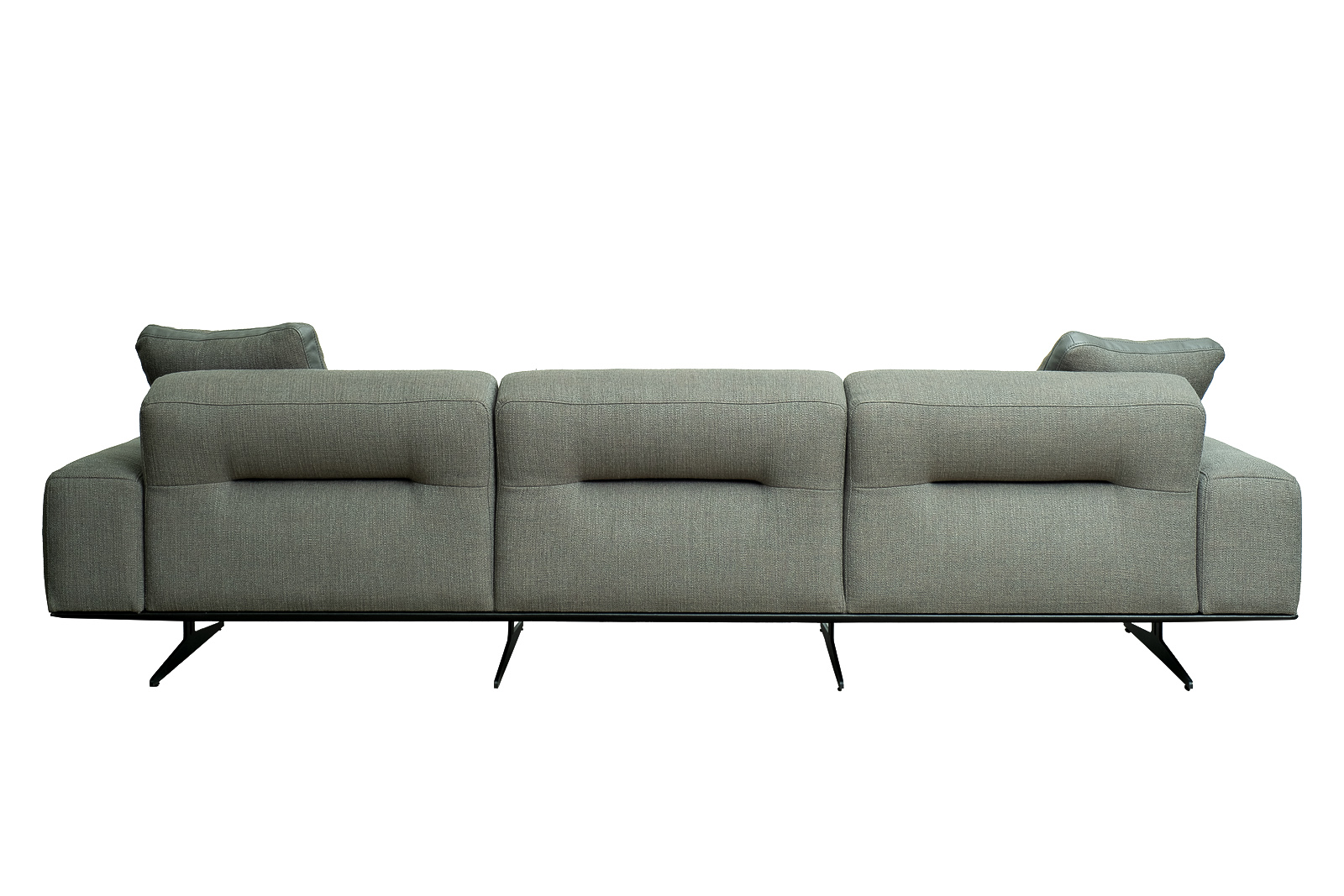 Комплект мебели №14 диван модульный PORTO (левый угол). В состав комплекта входит: основание трехместное-1шт, выполнена в иск.коже Magic01; подлокотник низкий-2шт; сиденье с высокой спинкой-3шт; отдельностоящий пуф- 1шт. Основная ткань комплекта- рогожка Norton Graphite из коллекции тканей Garda Decor. В сотав комплекта входят декоративные подушки: 50*50см с бурлетом 2шт- в ткани Norton Graphite, бурлет- иск.кожа Enzo697; 40*40см с кантом 2шт- в иск.коже Enzo 697. Металлические опоры- 170см, цвет черный. Габариты комплекта: ширина-294см, глубина- 194см, высота-75см. Глубина пуфа- 107см, глубина посадочного места- 82см, высота посадочного места- 45см