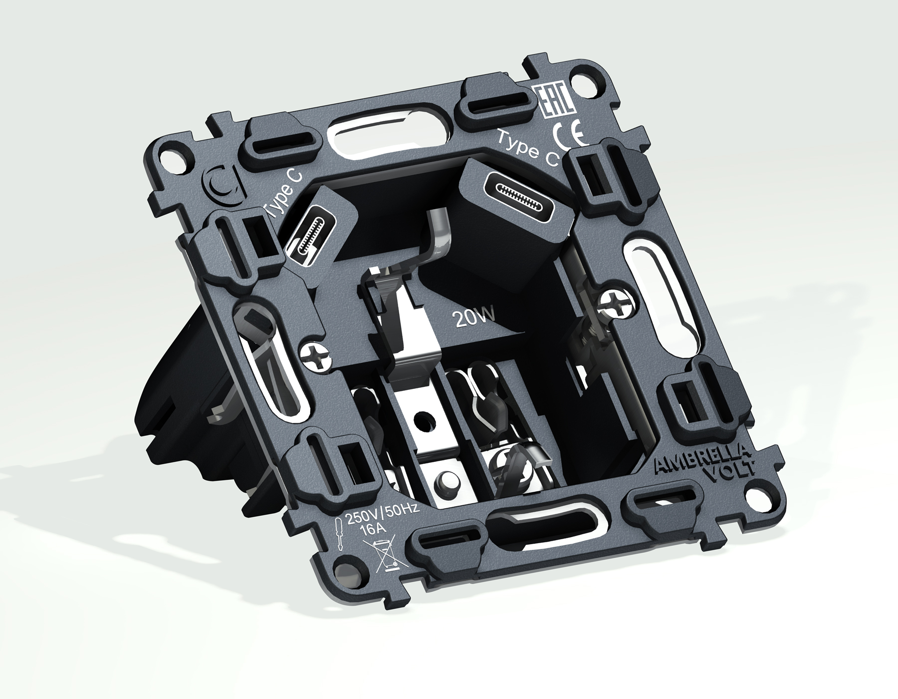 Купить "Механизм электрической розетки Type С+C 20W быстрая зарядка с заземлением на винтовых зажимах 16A-250V Ambrella Volt Quant QUANT VM165"