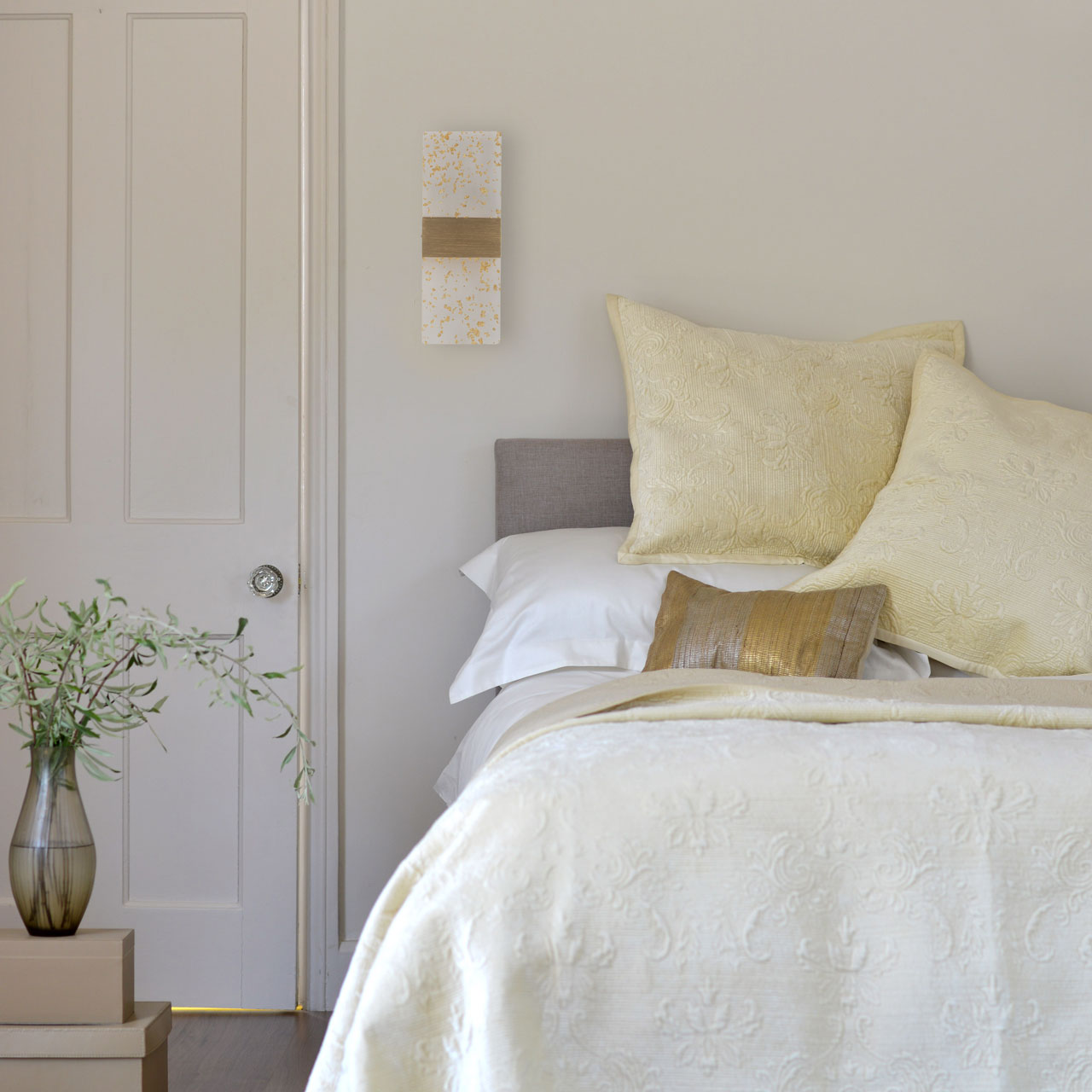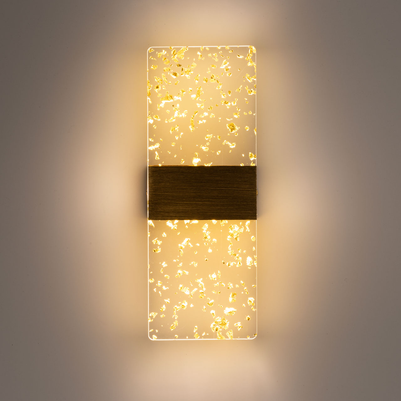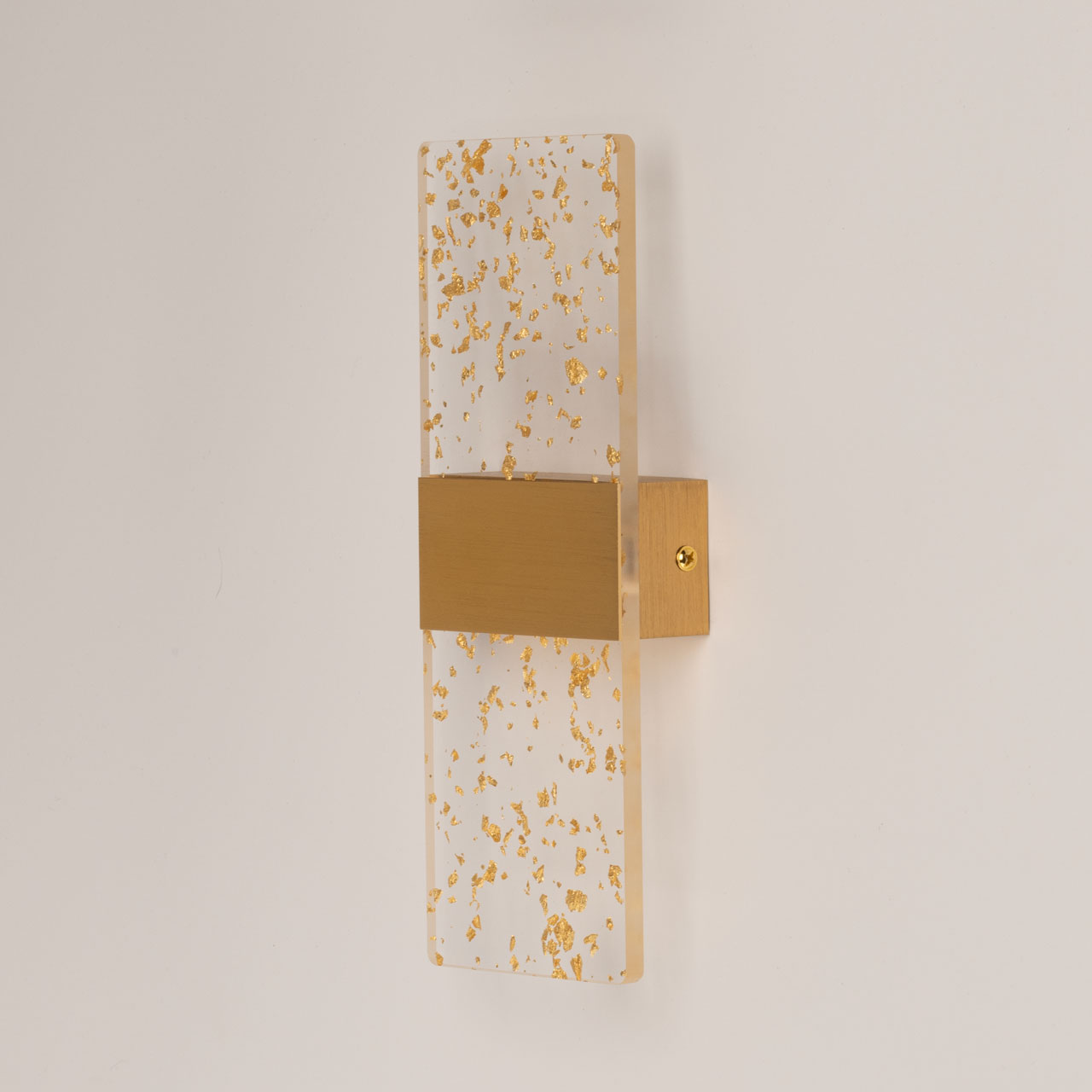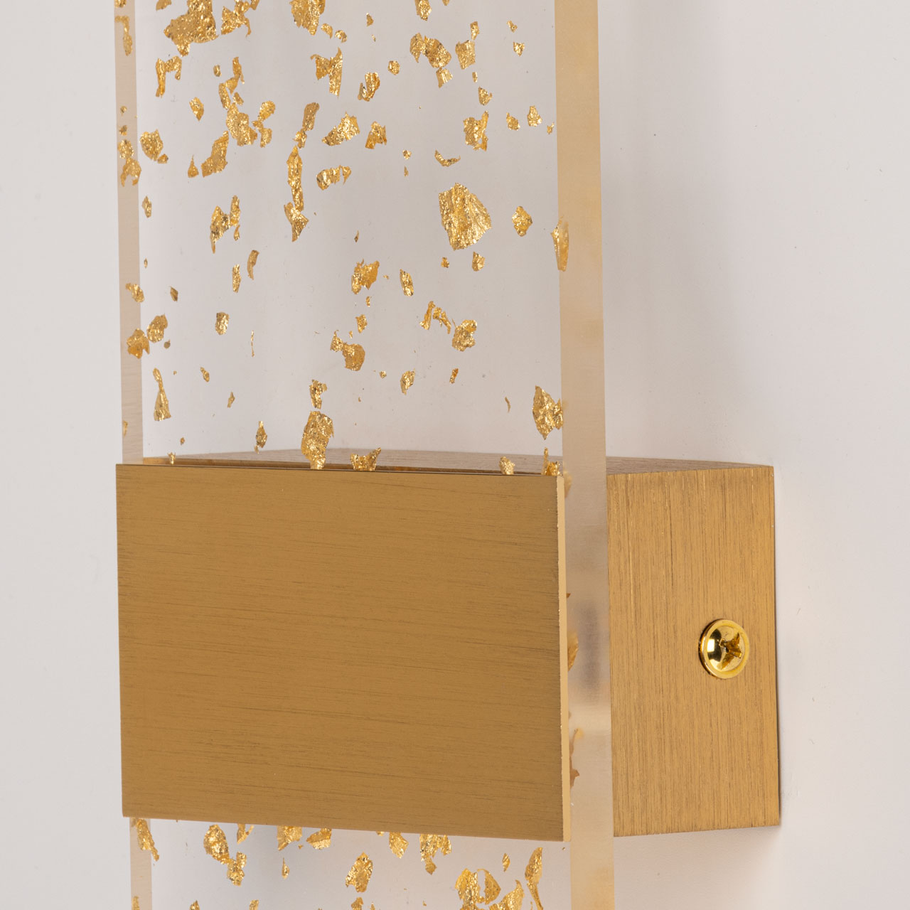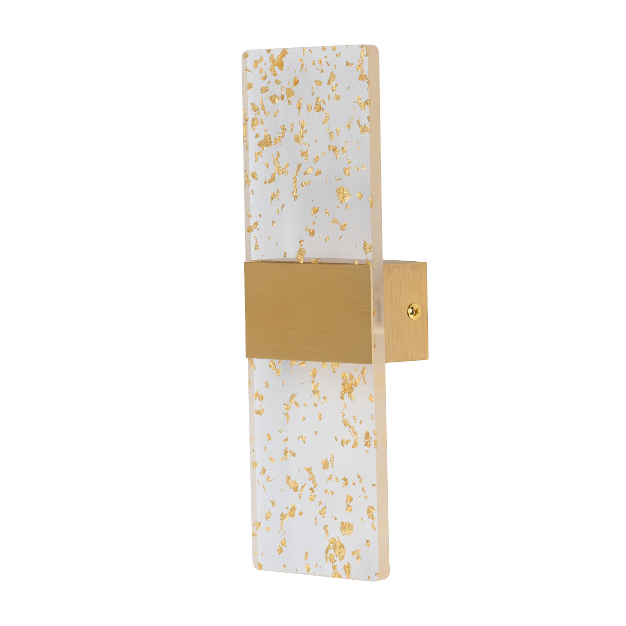 Металлическое основание настенного бра окрашено в цвет золота. Основа плафона выполнена из сплава алюминия с цинком, обработана по технологии брашинг и окрашена в цвет основания. Настенное бра декорировано прозрачным акрилом с вкраплениями золотого цвета.