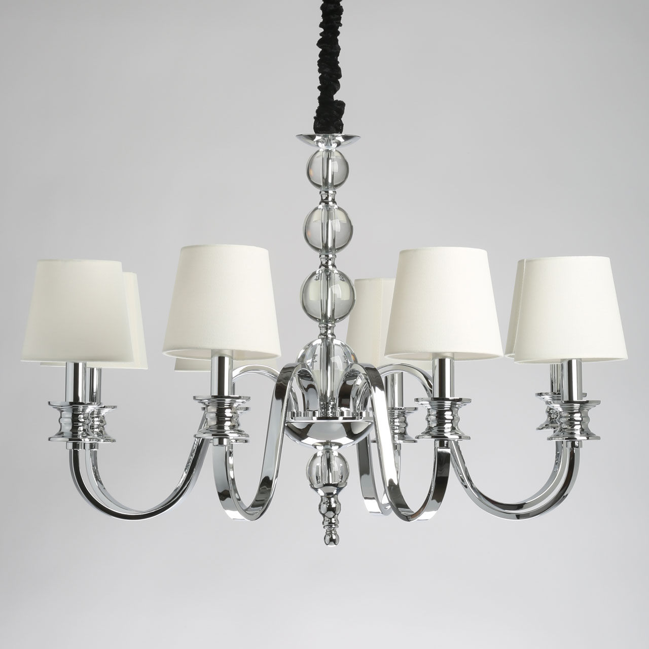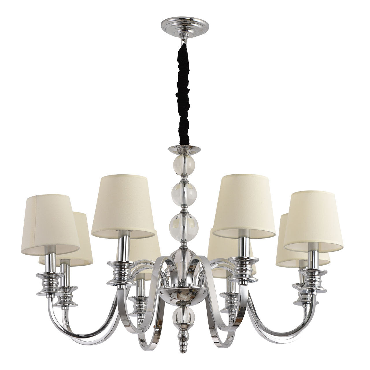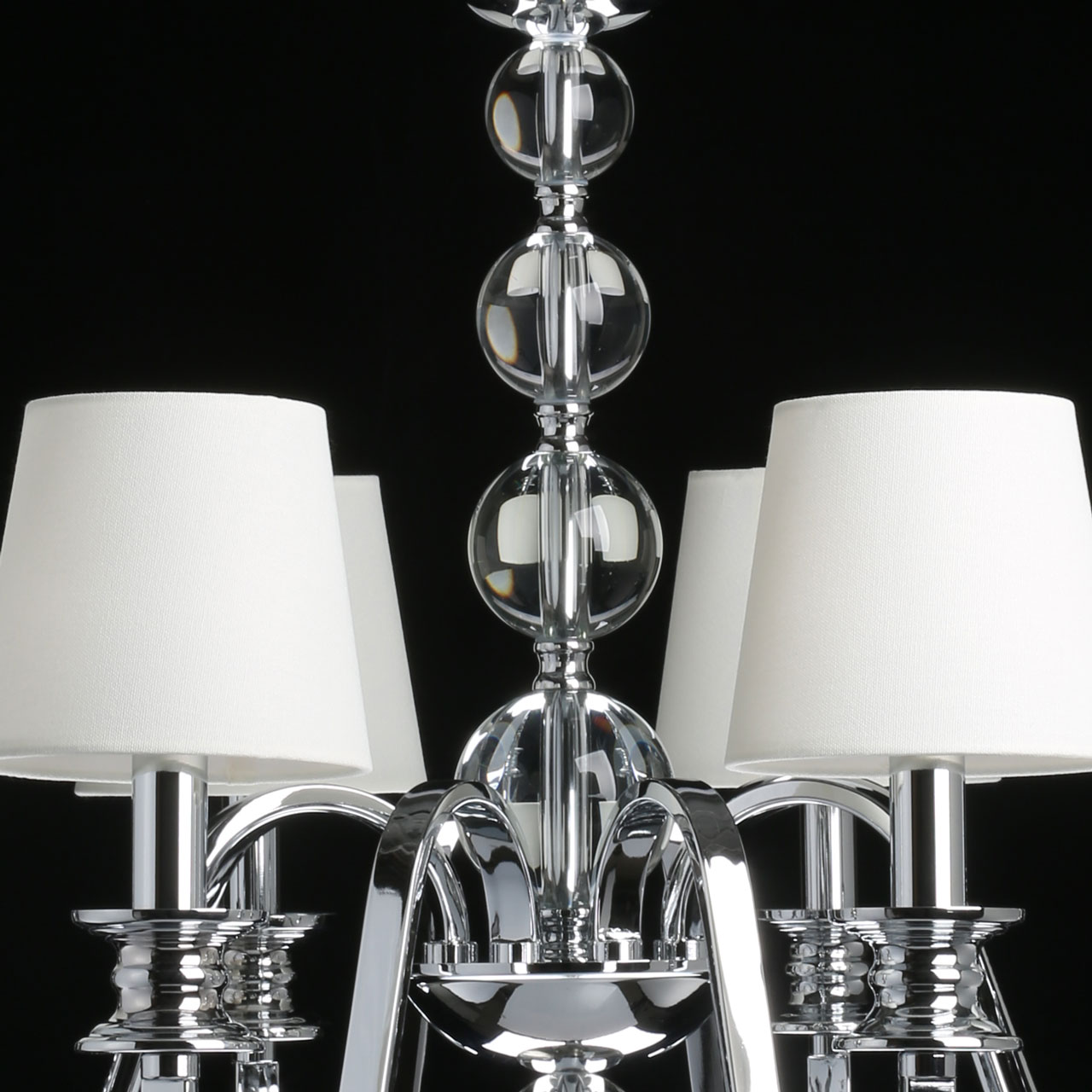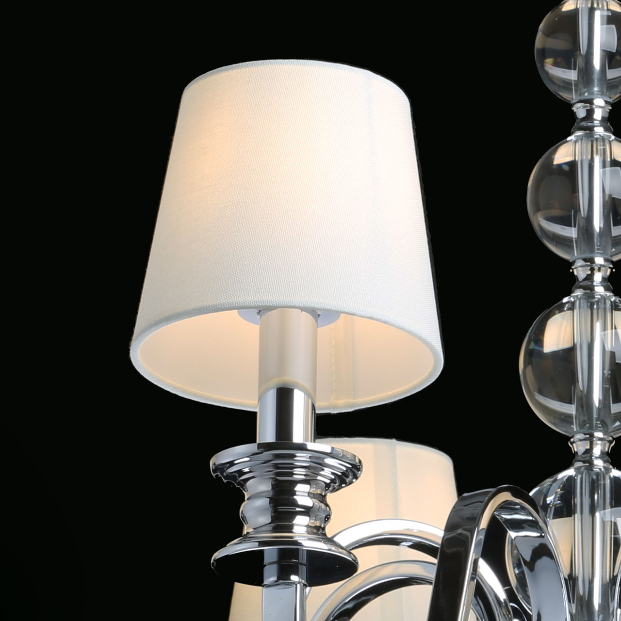 Металлическое основание подвесной люстры гальванизировано в цвет хрома. Источники света закрыты двойными текстильными абажурами белого цвета, где внутренний слой выполнен из прозрачного термостойкого акрила. Люстра декорирована сферами из массива хрусталя.