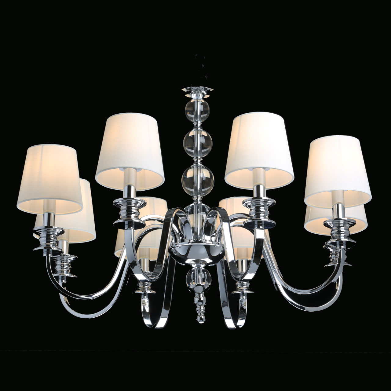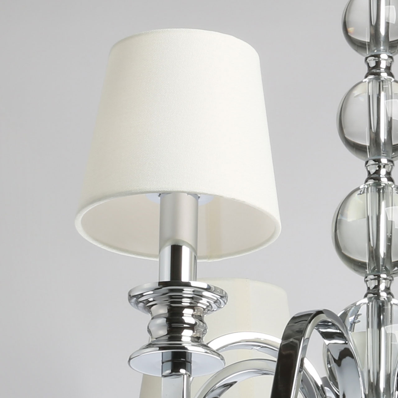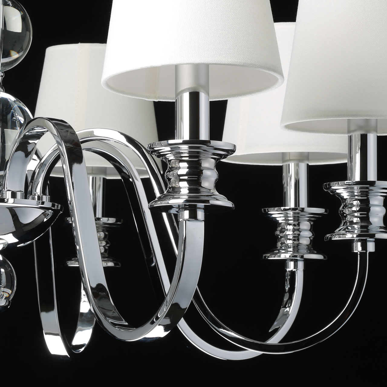 Металлическое основание подвесной люстры гальванизировано в цвет хрома. Источники света закрыты двойными текстильными абажурами белого цвета, где внутренний слой выполнен из прозрачного термостойкого акрила. Люстра декорирована сферами из массива хрусталя.