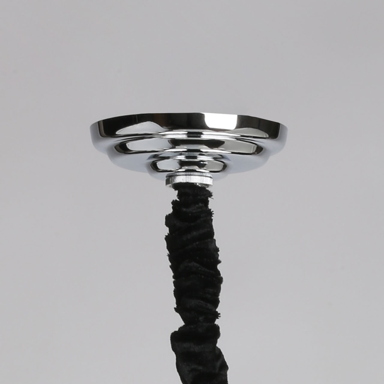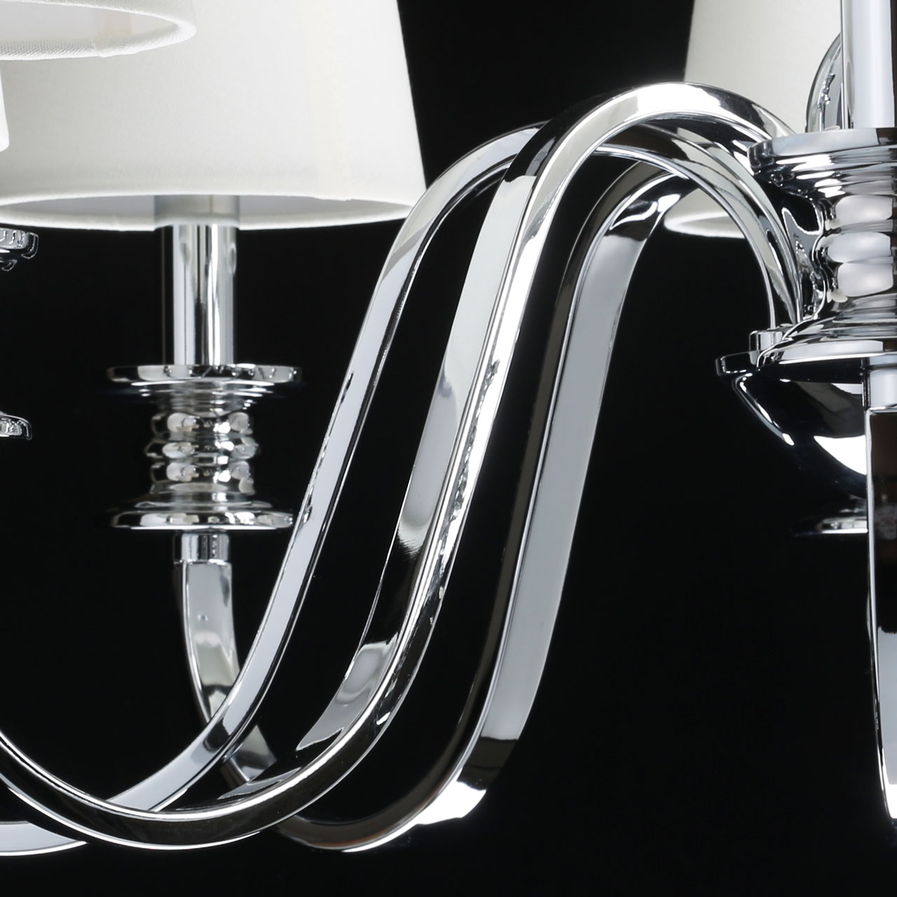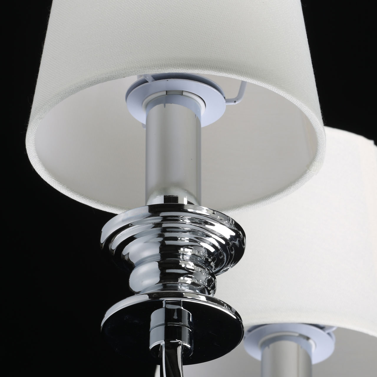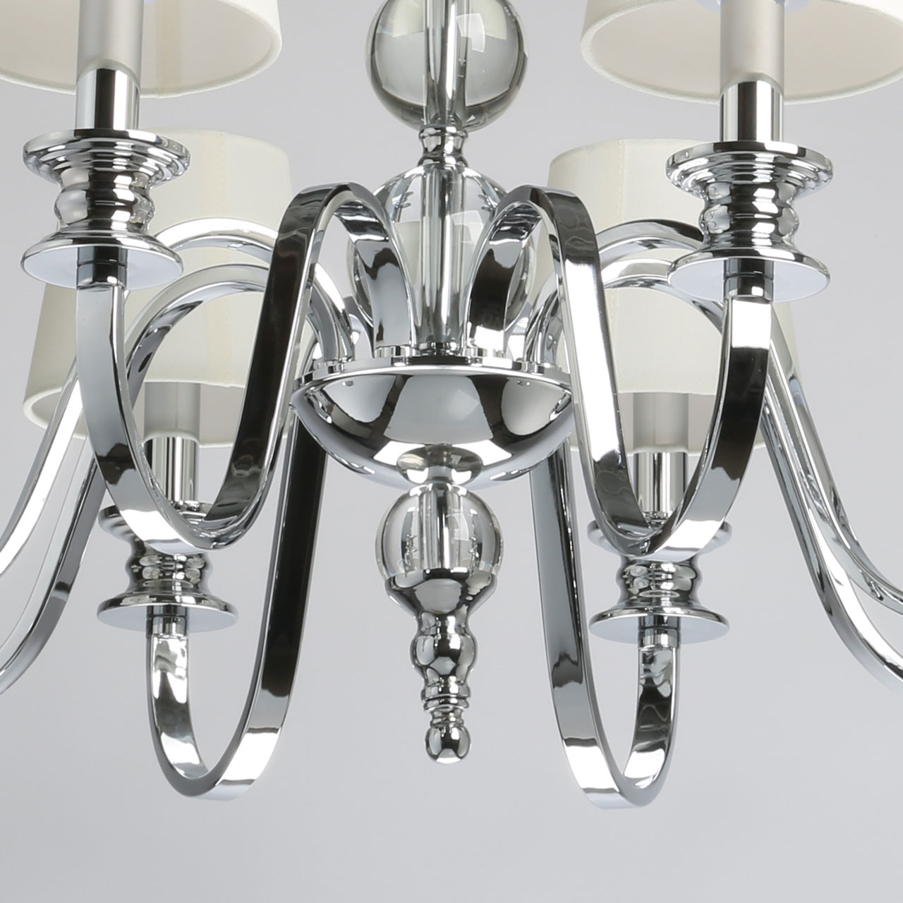 Металлическое основание подвесной люстры гальванизировано в цвет хрома. Источники света закрыты двойными текстильными абажурами белого цвета, где внутренний слой выполнен из прозрачного термостойкого акрила. Люстра декорирована сферами из массива хрусталя.