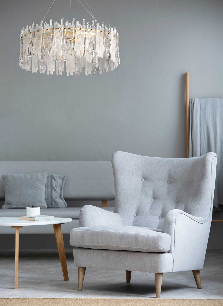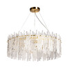 Трендовый дизайн подвесной люстры подчеркнут актуальным цветом латуни. Оригинальные стеклянные пластины декора придают люстре неповторимости и индивидуальности. Заменяемые источники света удобны в эксплуатации. Возможность регулировать комфортную высоту.