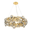 Металлическое основание и плафон подвесной люстры гальванизированы в цвет золота. Металлический плафон выполнен по технологии лазерной резки. Люстра декорирована прозрачным хрусталем круглой формы.