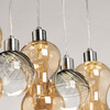 Металлическое основание подвесной люстры окрашено в черный цвет. Держатели плафонов гальванизированы в цвет хрома. Стеклянные плафоны выдуваются в сложную форму и гальванизированы в цвет шампань или в дымчатый цвет.