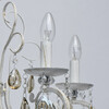 Металлическое основание обработано в технике хай-лайт: на белую основу нанесен слой золотого покрытия, что создает эффект старинного украшения. Люстра богато декорирована бусами из круглого хрусталя и подвесками из хрустальных октагонов оттенка шампань. Изысканность модели подчеркивают изящные рожки со множеством изгибов. Учитывая отсутствие плафонов, их роль выполняют лампы в форме свечей.