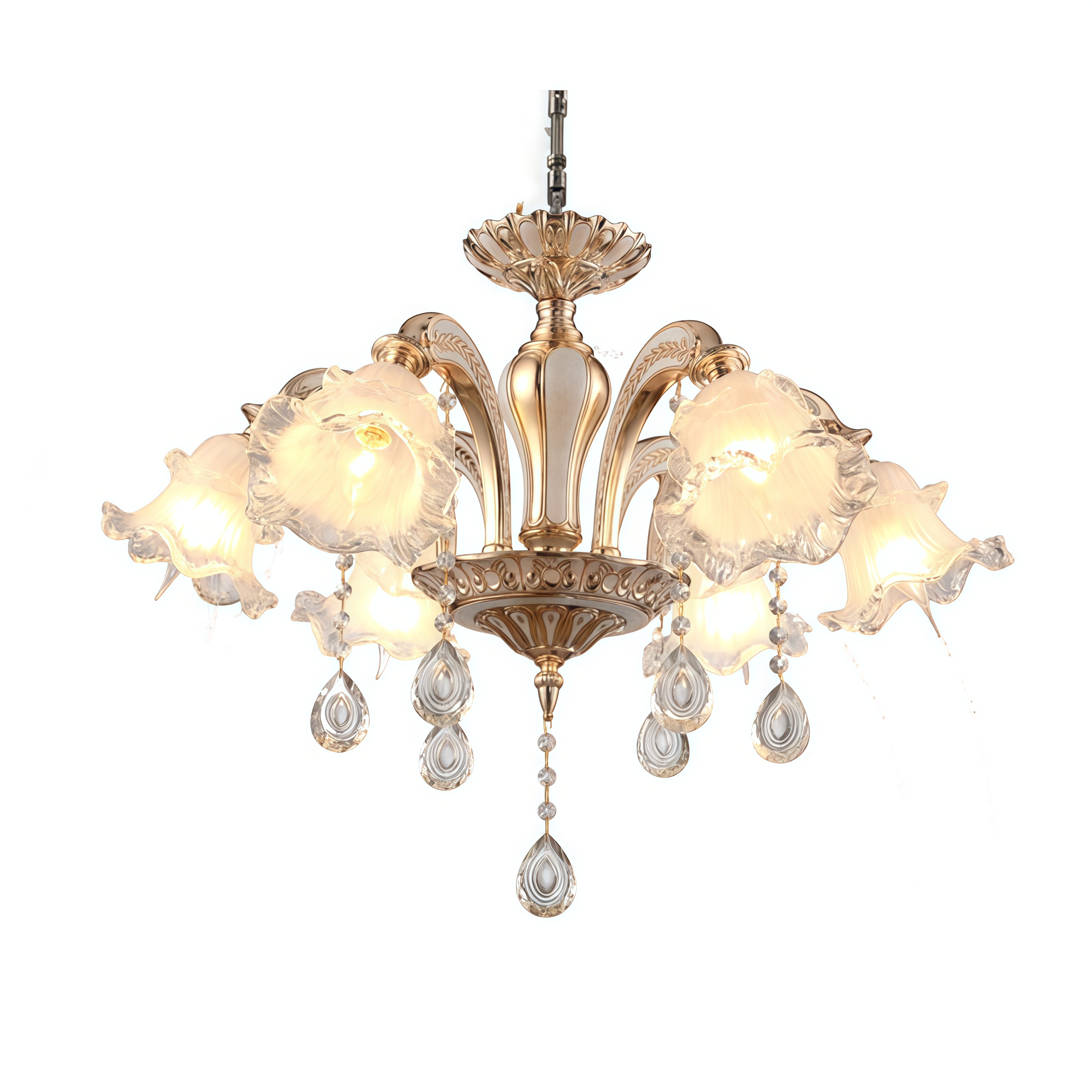 *Конструкция люстры* включает шесть плафонов из матового стекла, которые мягко рассеивают свет, создавая уютную атмосферу. Металлическая арматура с золотистым покрытием придает изделию роскошный вид и обеспечивает долговечность конструкции.