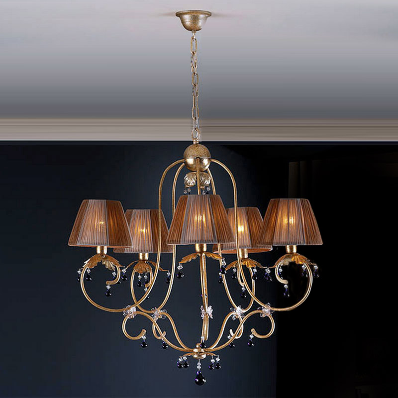 Подвесной светильник VOLGA выполнен из металла с покрытием "состаренное золото". Оснащен пятью световыми элементами под двухцветными плиссированными абажурами. Декорирован подвесками из прозрачного стекла и стекла аметистового цвета.