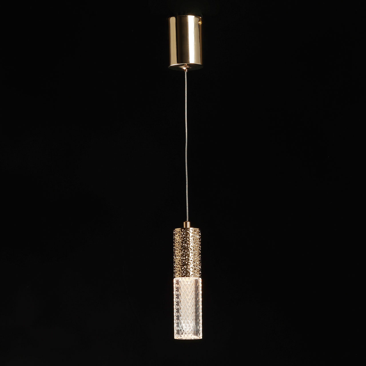 Металлическая потолочная чаша подвеса гальванизирована в цвет французского золота. Корпус плафона в виде цилиндра выполнен из сплава алюминия с цинком и гальванизирован в цвет основания. Светодиодный источник света закрыт прозрачным фактурным акрилом.