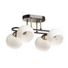 Металлическое основание потолочной люстры окрашено в черный цвет. Отдельные элементы гальванизированы в цвет античной бронзы. Светильник декорирован стеклянными плафонами белого матового цвета.