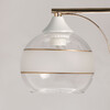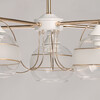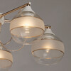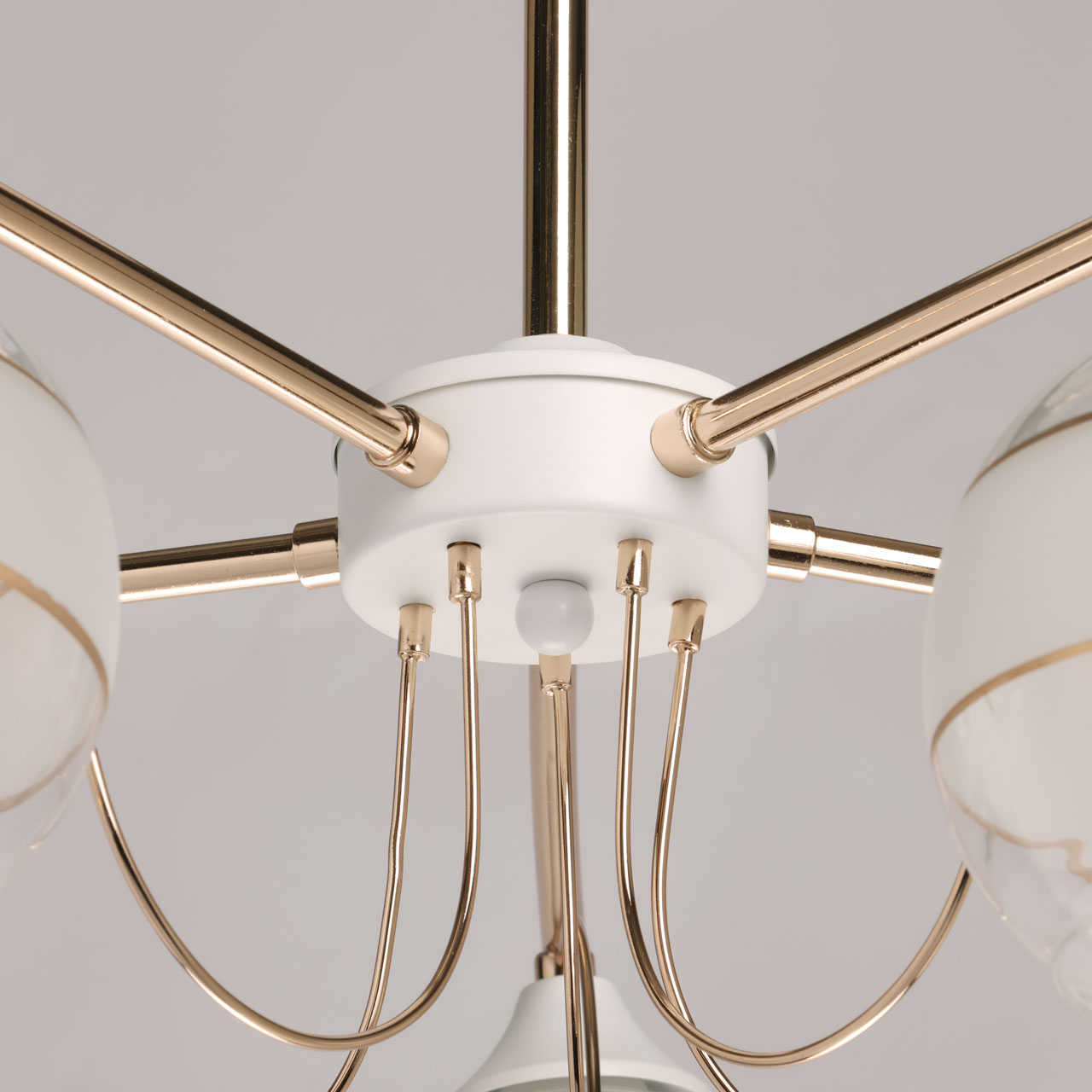 Металлическое основание потолочной люстры окрашено в белый цвет. Отдельные элементы основания гальванизированы в цвет золота. Выдувные вручную стеклянные плафоны матированы по трафарету. Матированная часть плафонов выделена золотым кантом.