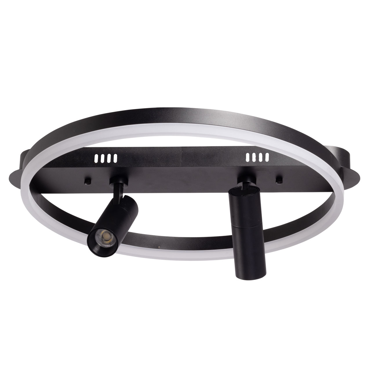 Металлическое основание потолочной люстры окрашено в черный цвет. Корпус плафона выполнен из сплава алюминия и окрашен в цвет основания. Светодиодный источник света закрыт матовым акрилом.