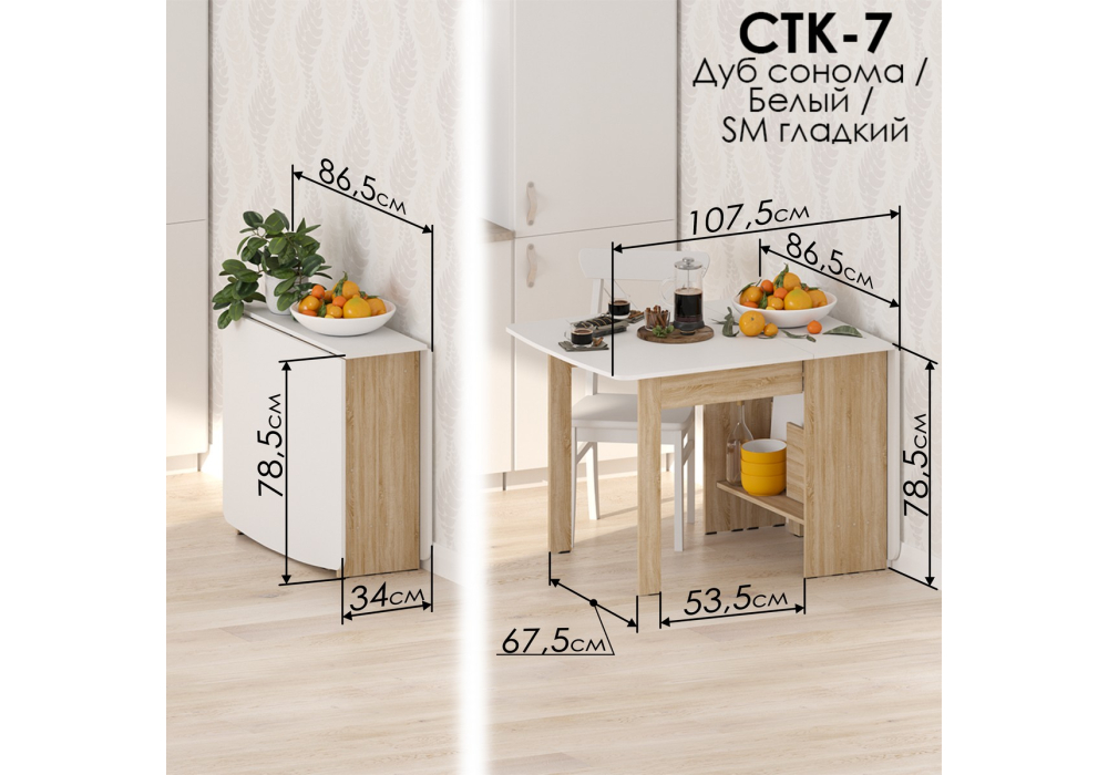 Материал каркаса - ЛДСП; Материал столешницы - ЛДСП; Цвет каркаса - Дуб сонома; Цвет ножек - Дуб сонома; Цвет столешницы - Белый; Ширина - 34,2 - 86,6; Высота - 78,5; Длина - 86,6 - 240,6;