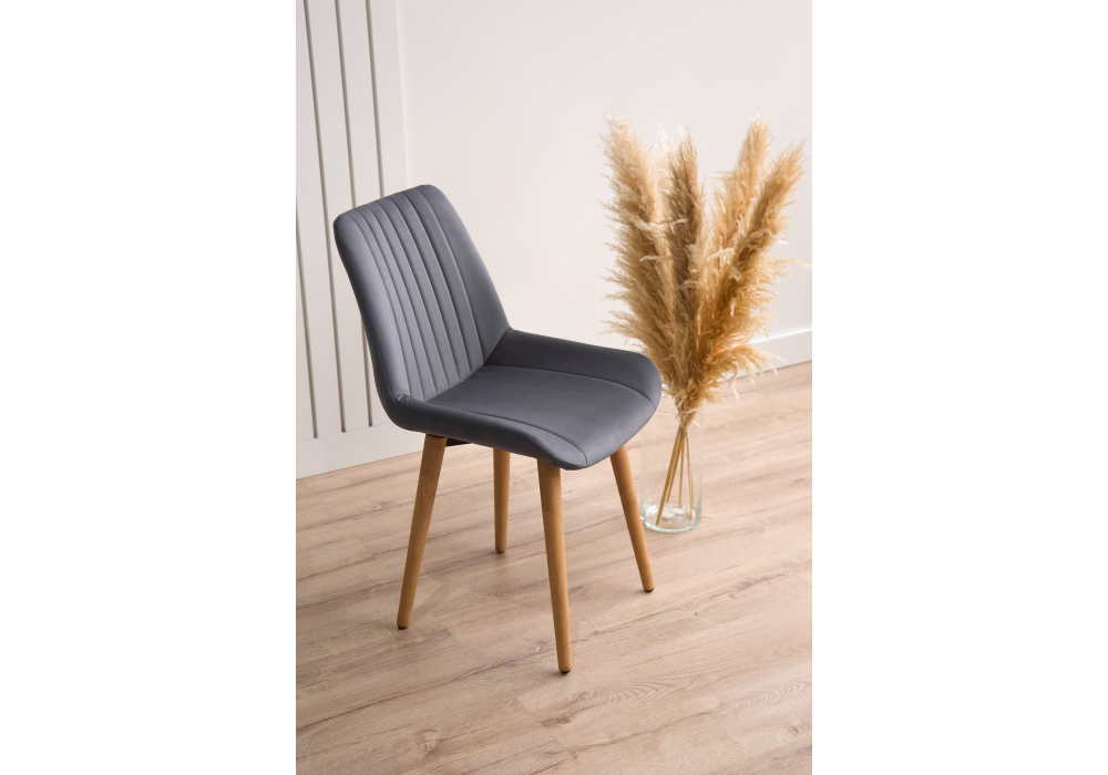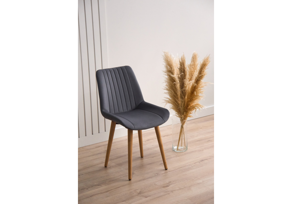 Материал каркаса - дерево; Материал сиденья - велюр; Материал обивки - велюр; Цвет ножек - натуральный; Ширина - 50; Глубина - 56; Высота - 82; Ширина сиденья - 47; Глубина сиденья - 42; Высота сиденья - 48;