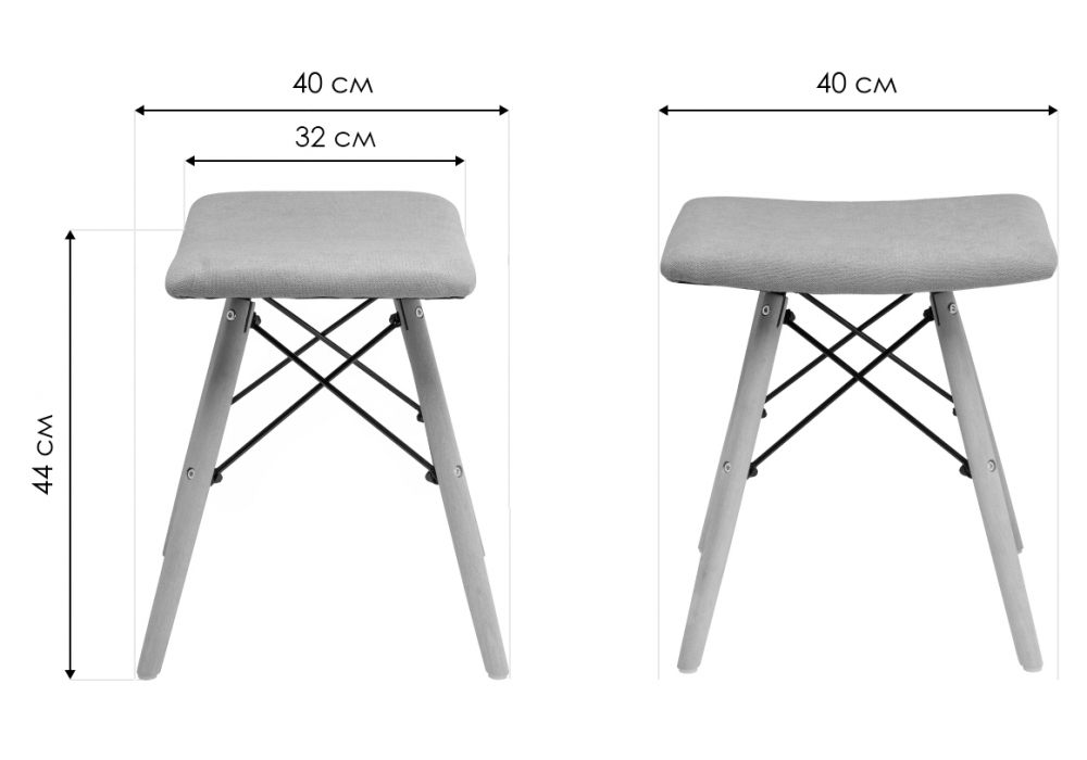 Материал каркаса - металл; Материал сиденья - ткань; Материал обивки - ткань; Ширина - 40; Глубина - 40; Высота - 44; Ширина сиденья - 40; Глубина сиденья - 32; Высота сиденья - 44;