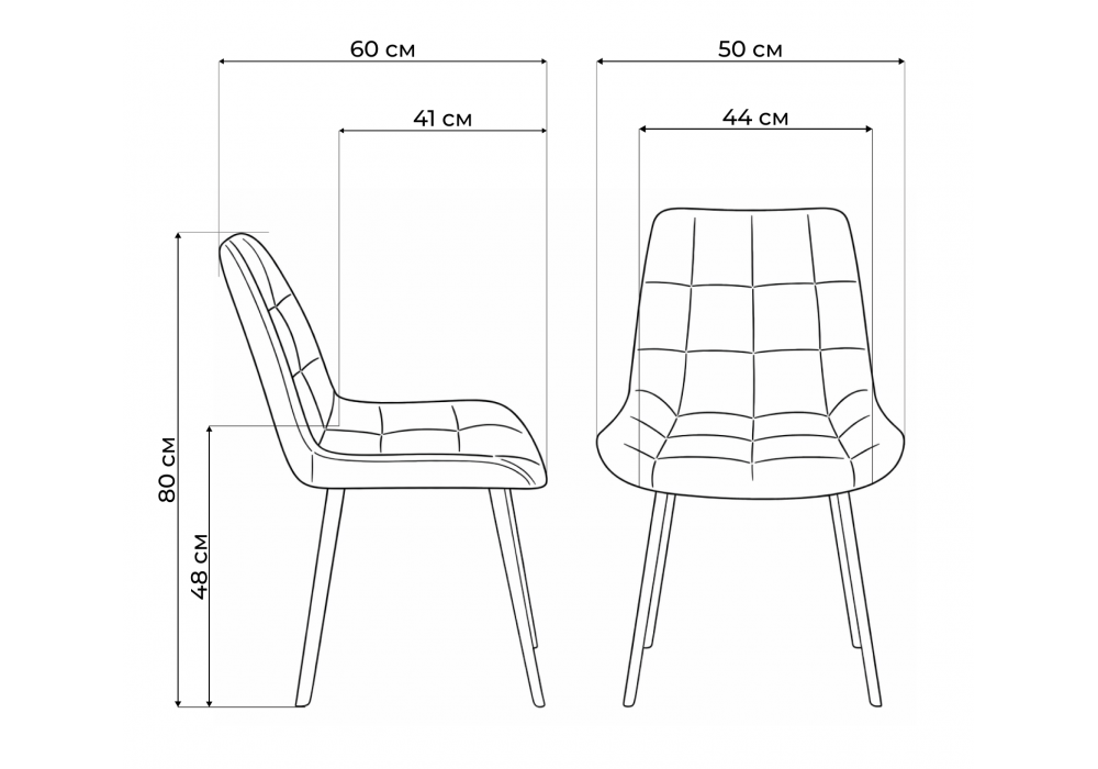 Материал каркаса - металл; Материал сиденья - велюр; Материал обивки - велюр; Цвет ножек - черный; Ширина - 50; Глубина - 60; Высота - 80; Ширина сиденья - 44; Глубина сиденья - 41; Высота сиденья - 48;