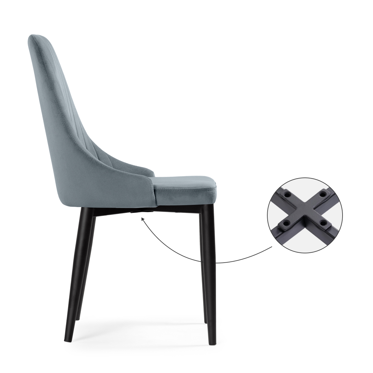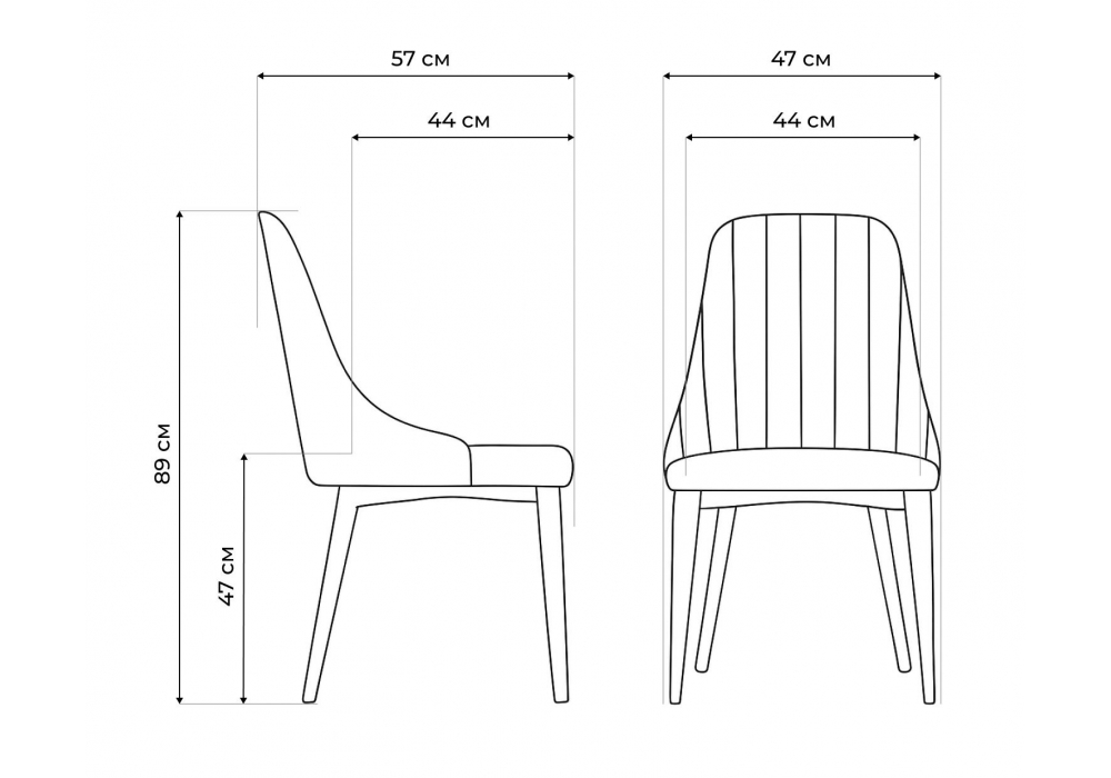 Материал каркаса - металл; Материал сиденья - велюр; Материал обивки - велюр; Цвет ножек - черный; Ширина - 47; Глубина - 57; Высота - 89; Ширина сиденья - 44; Глубина сиденья - 44; Высота сиденья - 47;