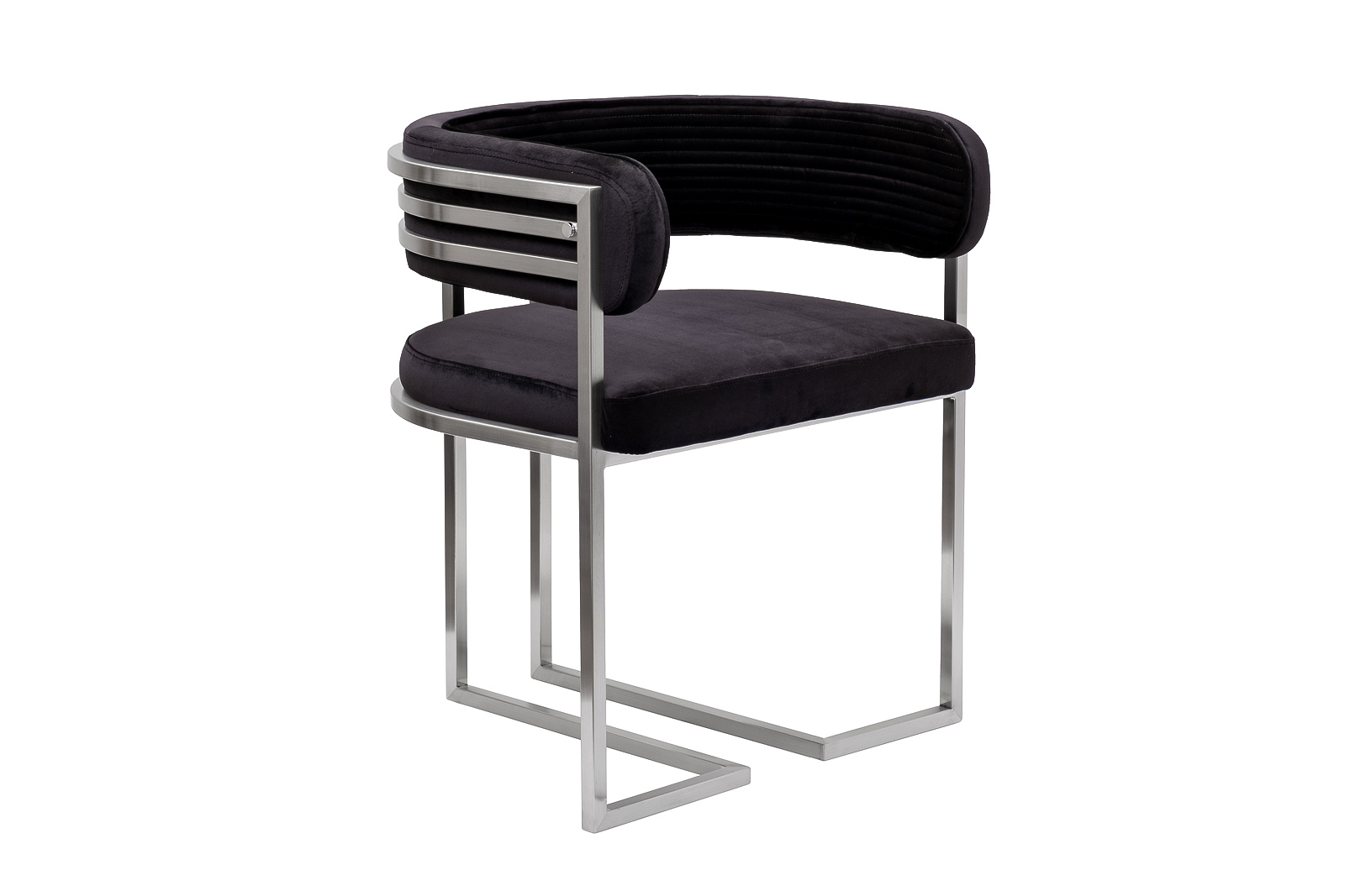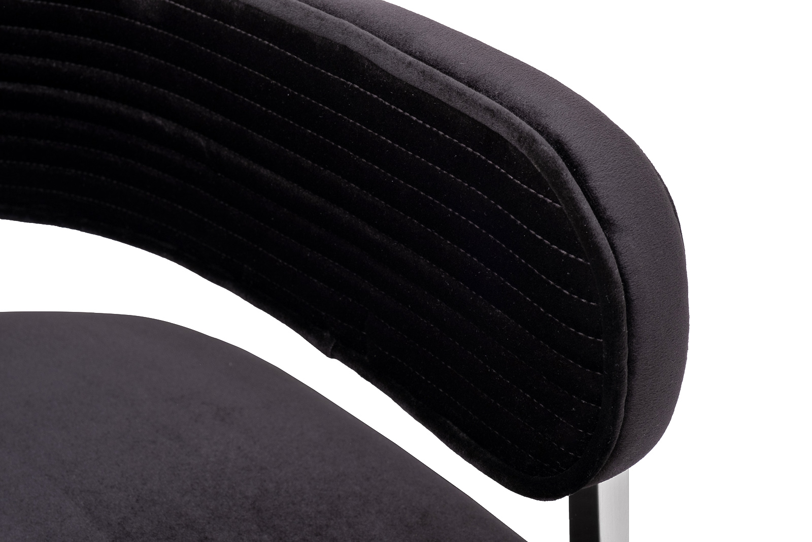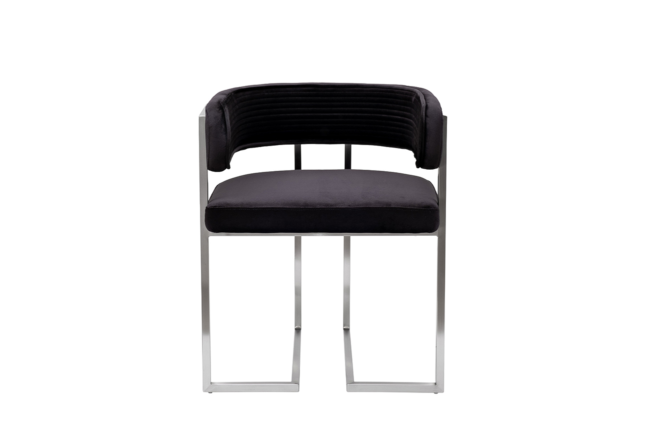 Велюровый черный стул с каркасом из матового хрома — скульптура для пространства, где глубина цвета встречается с чистотой линий. Его обивка из плотного велюра с рельефной стёжкой мягко обволакивает, продолжая изящество формы. Каркас из матового металла подчёркивает геометрию — чёткие плоскости, открытая конструкция, плавный изгиб спинки. Идеален для столовой или рабочего уголка в стиле ар-деко или фьюжн — где черный велюровый стул становится акцентом без лишних деталей. Это дизайнерский стул, в котором каждая деталь — от шва до кромки — говорит о продуманной эстетике.