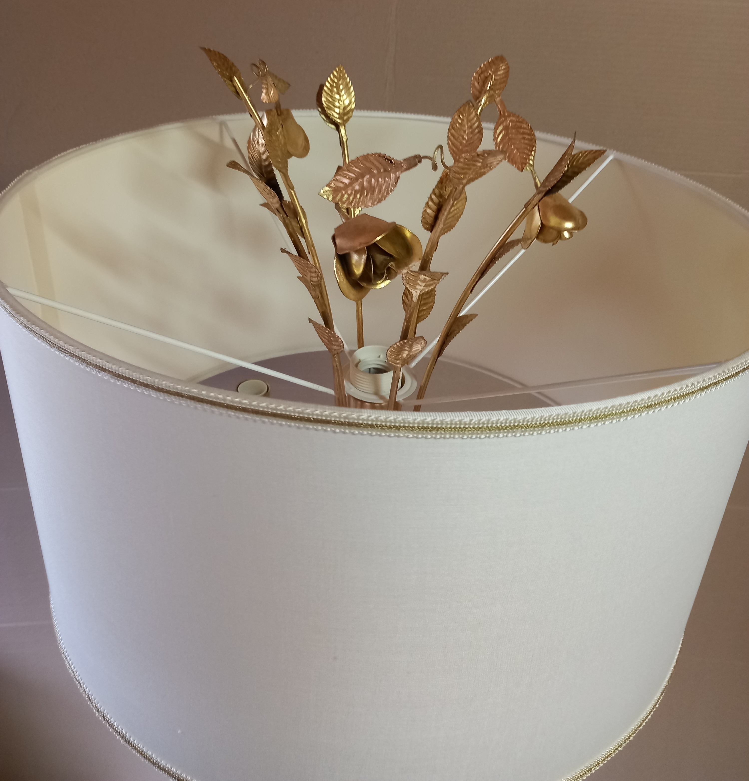 Торшер MM Lampadari 6988/LT3+1 00 V1669 из серии PARIS выполнен из металла золотого цвета. Четыре световых элемента расположены под абажуром из ткани белого цвета (3 цоколя Е14 и 1 Е27). Декорирован элементами в виде листьев и стеблей, обработанных методом воздушно-плазменной резки металла и керамическими розочками черного цвета, а также украшен подвесками из хрусталя Swarovski.